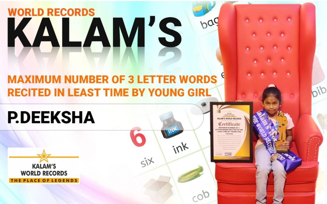 Born on 16-08-2014 From Thanjavur, Tamilnadu, India. She Has Created a New World Record by Reciting Maximum Number of 3 Letter Words in
