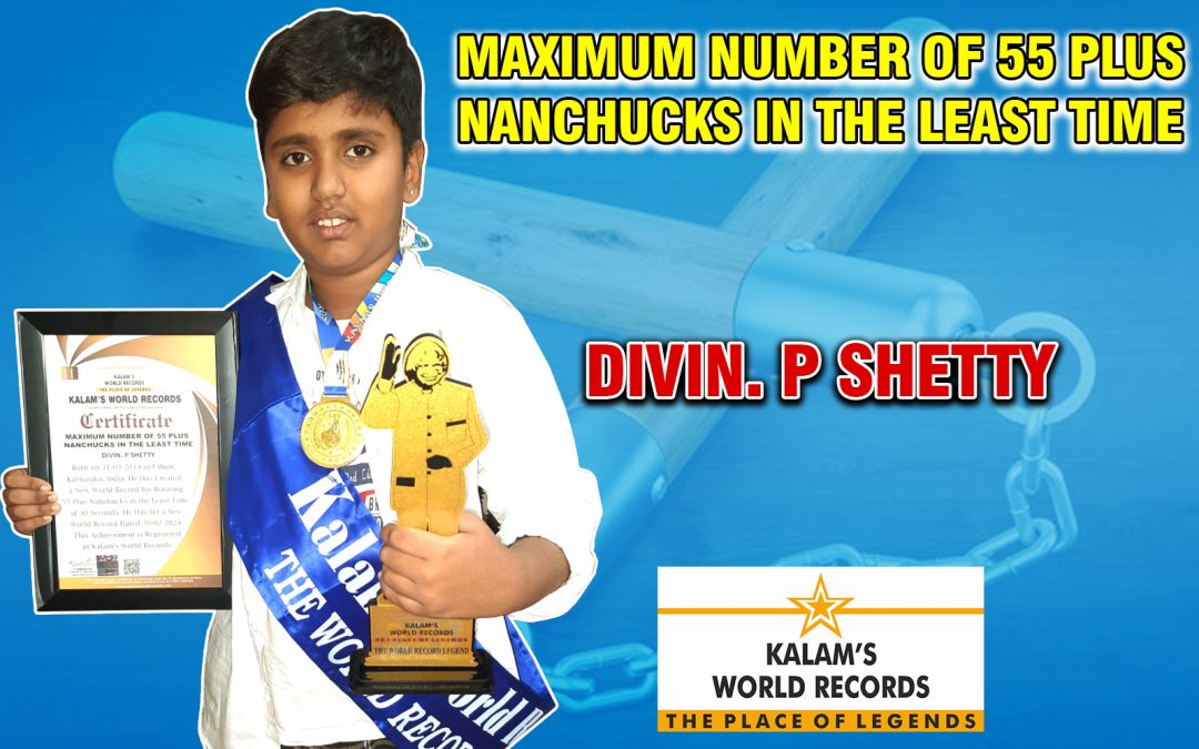Born on 31-03-2014 in Udupi, Karnataka, India. He Has Created a New World Record for Rotating 55 Plus Nanchucks in the Least Time of 30 Seconds. He Has Set a New World Record Dated 20-02-2024. This Achievement is Registered in Kalams World Records.