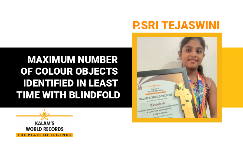 born on 08-02-2013 from Chennai, Tamilnadu, India. She has created a new world record by identifying a Maximum number of color objects in the least time with blindfold 218 (objects) and set a new world record dated on 30 January 2021. This achievement is registered in Kalam’s World Records.