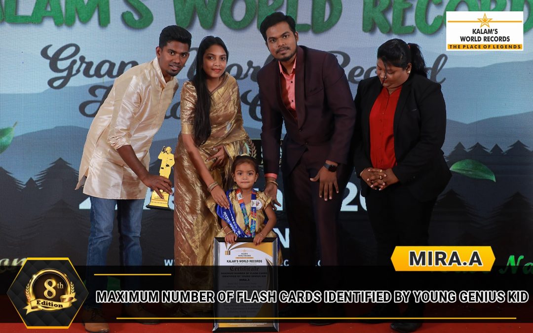 Born On15-03-2020 From Coimbatore, Tamilnadu, India. She Has Created a New World Record by Identifying Maximum Number of 1266 Flash Cards in 76 Different Categories at Tender Age of 2 Years and 7 Months. She Has Set a New World Record Dated 25-02-2023. This Achievement is Registered in Kalams World Records.