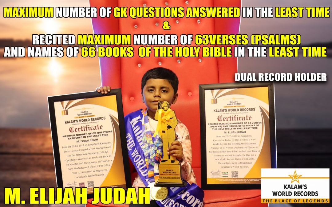 Born on 22-03-2017 in Bangalore, Karnataka, India. He Has Created a New World Record for Reciting the Maximum Number of 63 Verses (Psalms) and Names of 66 Books of the ‘holy Bible’ in the Least Time of 5 Minutes and 40 Seconds. He Has Set a New World Record Dated 23-01-2024. This Achievement is Registered in Kalam’s World Records.