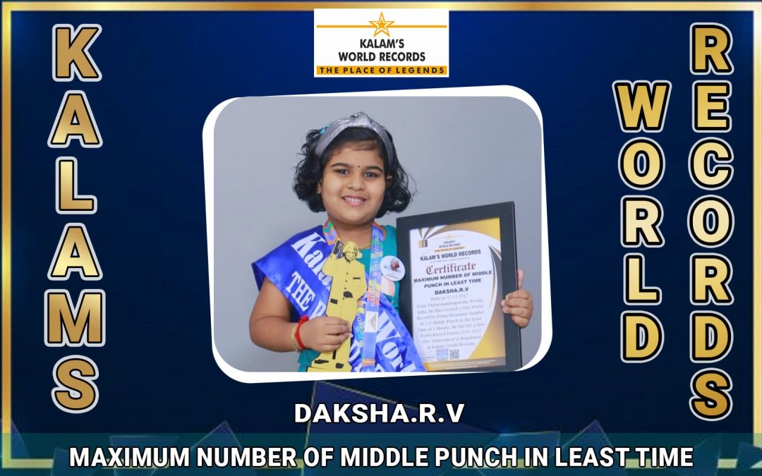 Born on 17-11-2017 From Thiruvananthapuram, Kerala, India. He Has Created a New World Record by Doing Maximum Number of 132 Middle Punch in the Least Time of 1 Minute. He Has Set a New World Record Dated 25-07-2022. This Achievement is Registered in Kalams World Records.