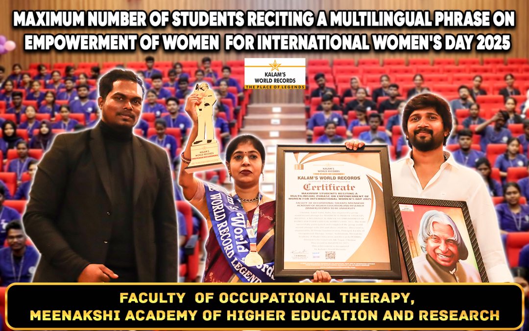 Chennai, Tamil Nadu, India, has organized a group World record attempt for MAXIMUM NUMBER OF STUDENTS RECITING A MULTILINGUAL PHRASE ON EMPOWERMENT OF WOMEN FOR INTERNATIONAL WOMEN’S DAY 2025. The team successfully participated and completed the group World record attempt with 180 and above students. This event is organized by Dr.Deepa Sundareswaran, Principal, Faculty of Occupational Therapy. Venue: Auditorium, Meenakshi Academy Of Higher Education And Research(MAHER), Deemed to be University KK Nagar Chennai. This record is dated 08-03-2025. This achievement is recognized by Kalam’s World Records.