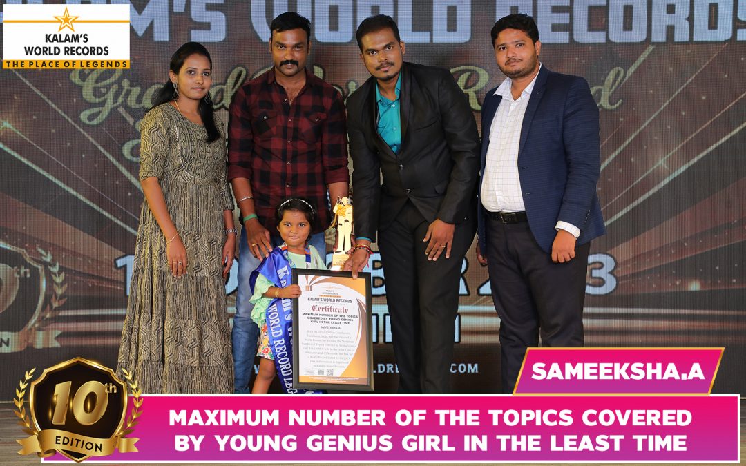 Born on 29-02-2020 in Coimbatore, Tamilnadu, India. She Has Created a World Record for Reciting the Maximum Number of Topics Covered by Young Genius Girl Total 408 Words in the Least Time of 8 Minutes and 33 Seconds. She Has Set a World Record Dated 12-08-2023. This Achievement is Registered in Kalams World Records.
