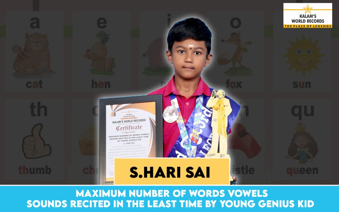 Born on 03-10-2018 in Thiruvannamalai, Tamil Nadu, India, he is appreciated for His Talent for the Maximum Number of Words vowel sounds recited in the Least Time, 1 Minute and 07 Seconds . We at Kalam’s World Records Appreciate His Talent, Honor Him on Stage With Big Applause, and Look Forward to His Future Stepping Stones. Achievement Date 18-03-2025.this Achievement is Recognized by Kalam’s World Records.