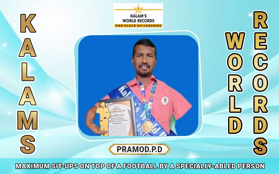 Born on 20-12-1983 From Idukki, Kerala, India. He Has Created a New World Record by Doing Maximum Number of 15 Sit-ups on Top of a Football by a Specially-abled Person in the Least Time of 25 Seconds. He Has Set a New World Record Dated 17-10-2022. This Achievement is Registered in Kalams World Records.