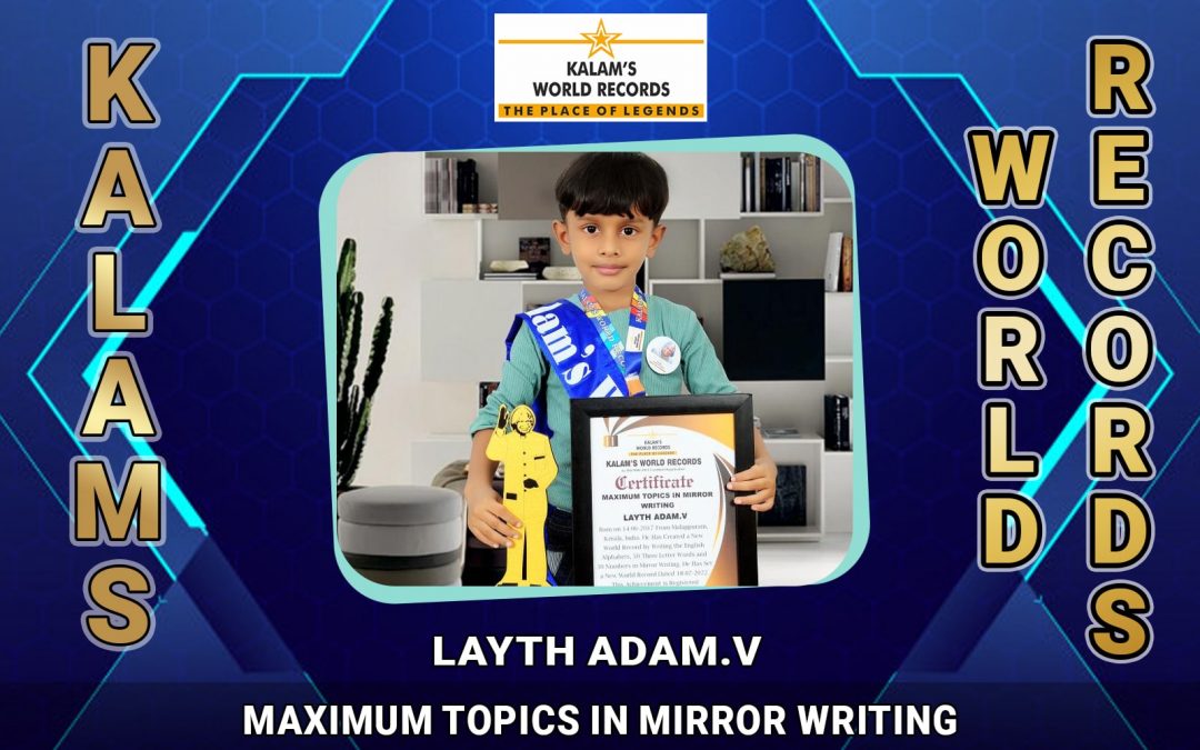 Born on 14-06-2017 From Malappuram, Kerala, India. He Has Created a New World Record by Writing the English Alphabets,50 Three Letter Words and 30 Numbers in Mirror Writing. He Has Set a New World Record Dated 18-07-2022. This Achievement is Registered in Kalams World Records.
