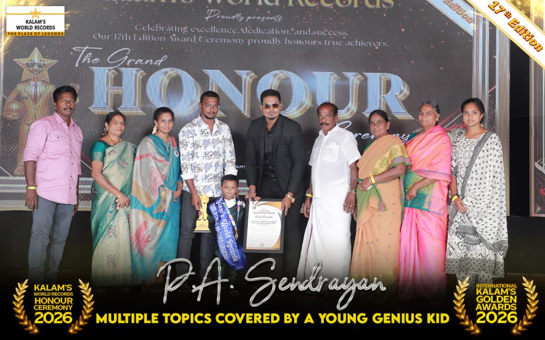 Planets 8, Colours 11, Fruits 19, Vegetables 18, Animals 24, Transports 15, Home appliances 8, Birds 7, Foods 17, Total words – 337. We appreciate his outstanding talent and honour him on stage, wishing him continued success. This achievement was accomplished on 22-01-2026 and has been officially recognized and registered by Kalam’s World Records.