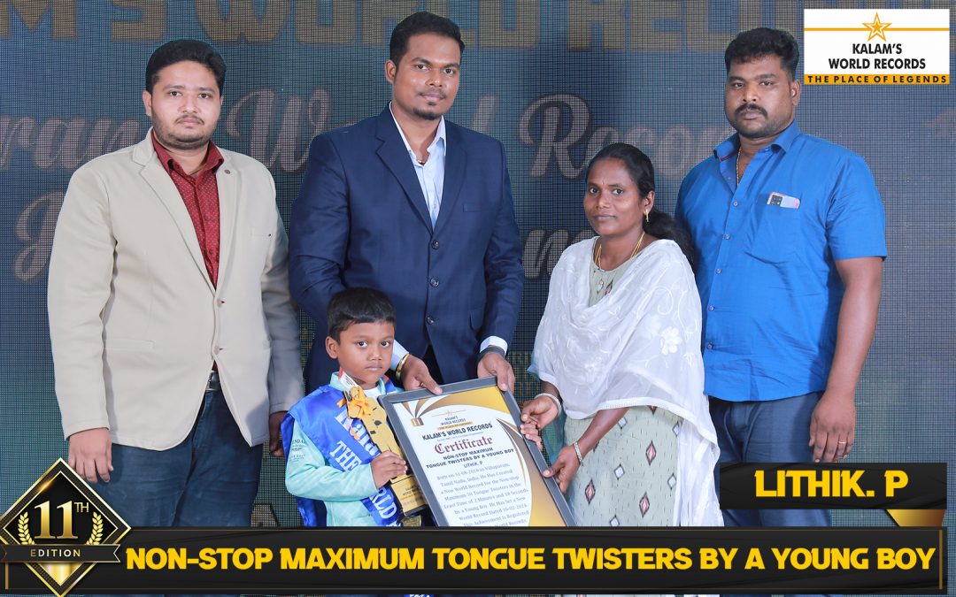 Born on 31-08-2018 in Villupuram, Tamil Nadu, India. He Has Created a New World Record for the Non-stop Maximum 50 Tongue Twisters in the Least Time of 2 Minutes and 18 Seconds by a Young Boy. He Has Set a New World Record Dated 16-02-2024. This Achievement is Registered in Kalam’s World Records.