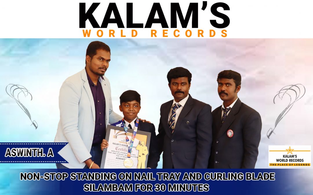 Born on 12-03-2011 From Madurai, Tamilnadu, India. He Has Created a New World Record by Doing Non-stop Standing on Nail Tray and Curling Blade Silambam for 30 Minutes. He Has Set a New World Record Dated 01-05-2022, under the Guidance of Sensei B. Sai Suthakar Founder of the Sai Traditional Art. Venue: Blessing Matriculation Higher Secondary School, Achampathu, Madurai. This Achievement Is Registered in Kalam’s World Records