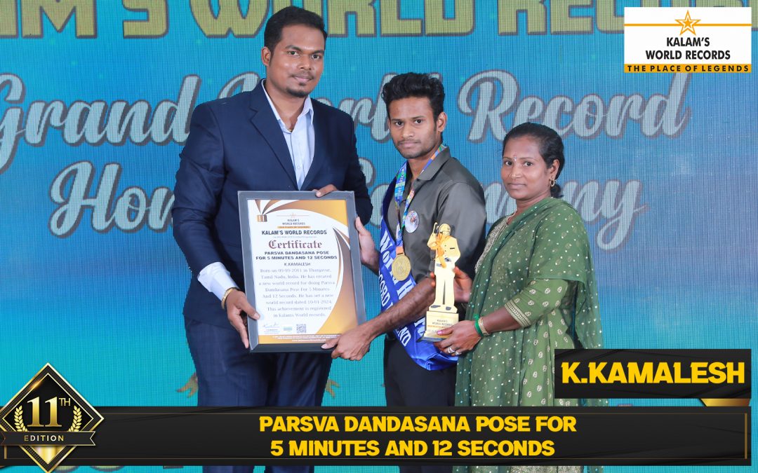 Born on 09-09-2001 in Thanjavur, Tamil Nadu, India. He Has Created a New World Record for Doing Parsva Dandasana Pose for 5 Minutes and 12 Seconds. He Has Set a New World Record Dated 10-01-2024. This Achievement is Registered in Kalams World Records.