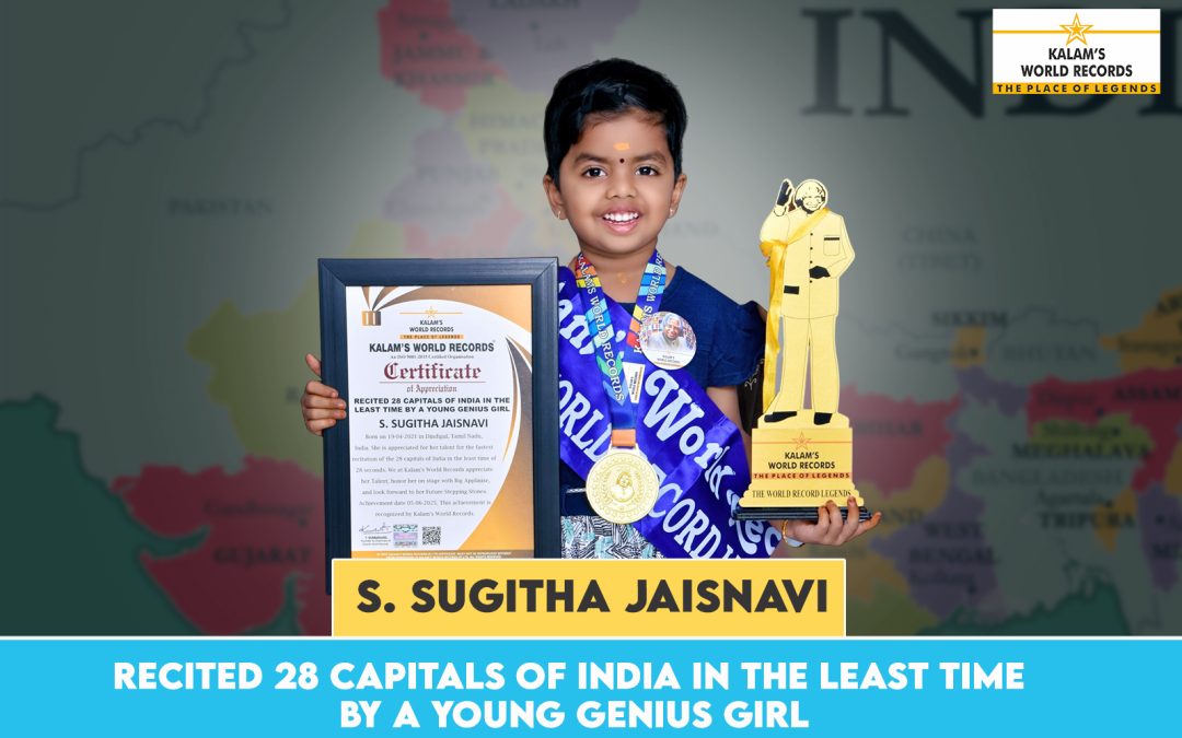 Born on 19-04-2021 in Dindigul, Tamil Nadu, India. She is appreciated for her talent for the fastest recitation of the 28 capitals of India in the least time of 28 seconds. We at Kalam’s World Records appreciate her Talent, honor her on stage with Big Applause, and look forward to her Future Stepping Stones. Achievement date 05-06-2025. This achievement is recognized by Kalam’s World Records.