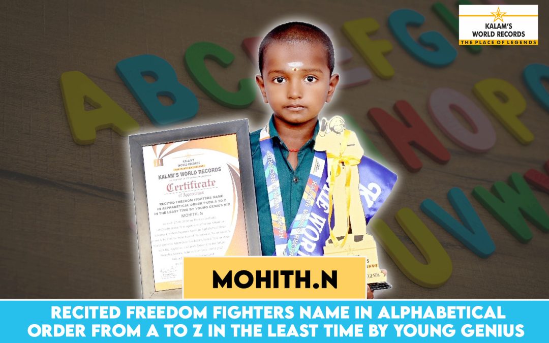 Born on 27-06-2020 in Thiruvannamalai, Tamilnadu, India. he is Appreciated for His Talent for Reciting Freedom Fighters Name in Alphabetical Order From a to Z in the Least Time of 38 Seconds. .we at Kalam’s World Records Appreciate His Talent, Honor Him on Stage With Big Applause, and Look Forward to His Future Stepping Stones. Achievement Date 18-03-2025.this Achievement is Recognized by Kalam’s World Records.