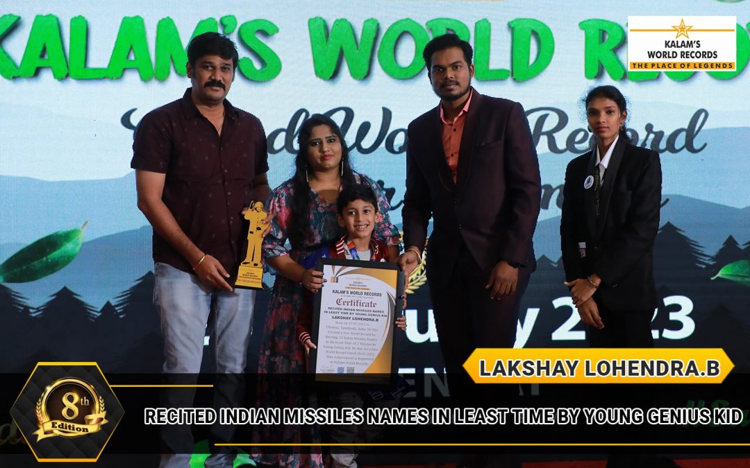 Born on 17-07-2017 in Chennai, Tamilnadu, India. He Has Created a New World Record by Reciting 53 Indian Missiles Names in the Least Time of 2 Minutes by Young Genius Kid. He Has Set a New World Record Dated 26-01-2023. This Achievement is Registered in Kalams World Records.