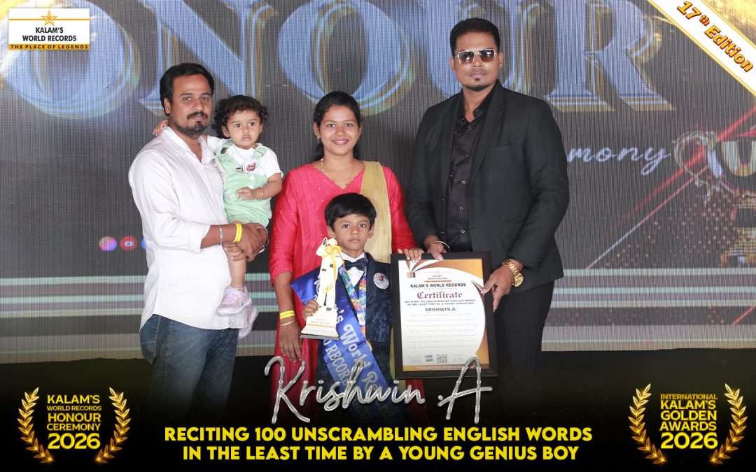 Born on 21-06-2019 in Thiruvallur, Tamil Nadu, India. He Has Created a New World Record for the Fastest Reciting 100 Unscrambling English Words in the Least Time of 48 Seconds At the Age of 6 Years and 6 Months by a Young Genius Boy. He Has Set a New World Record. This Outstanding Achievement Was Successfully Accomplished on 23-01-2026 and Has Been Officially Recognized and Registered by Kalam’s World Records.