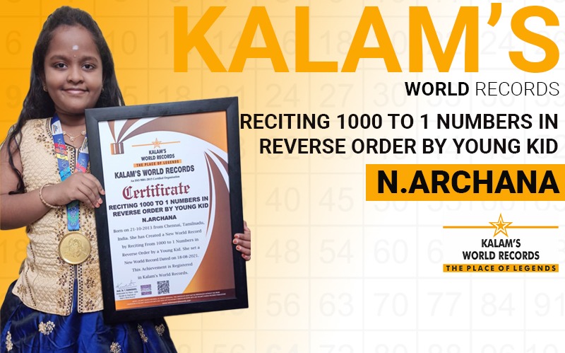 Born on 21-10-2013 from Chennai, Tamilnadu, India. She has created a New World Record by Reciting From 1000 to 1 Numbers in Reverse Order by a Young Kid. She Set a New World Record Dated on