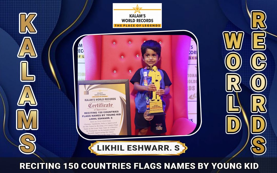 Born on 29-02-2020 From Chennai, Tamilnadu, India is Appreciated for His Talent by Reciting 150 Counter Flags Name in the Least Time Time of 9 Minutes by Young Kid. As We Kalam’s World Records Appreciating His Talent and Honoring Him in the Stage of Big Applause and for His Future Stepping Stone. Achievement Dated 25-08-2022. This Achievement is Registered in Kalam’s World Records.