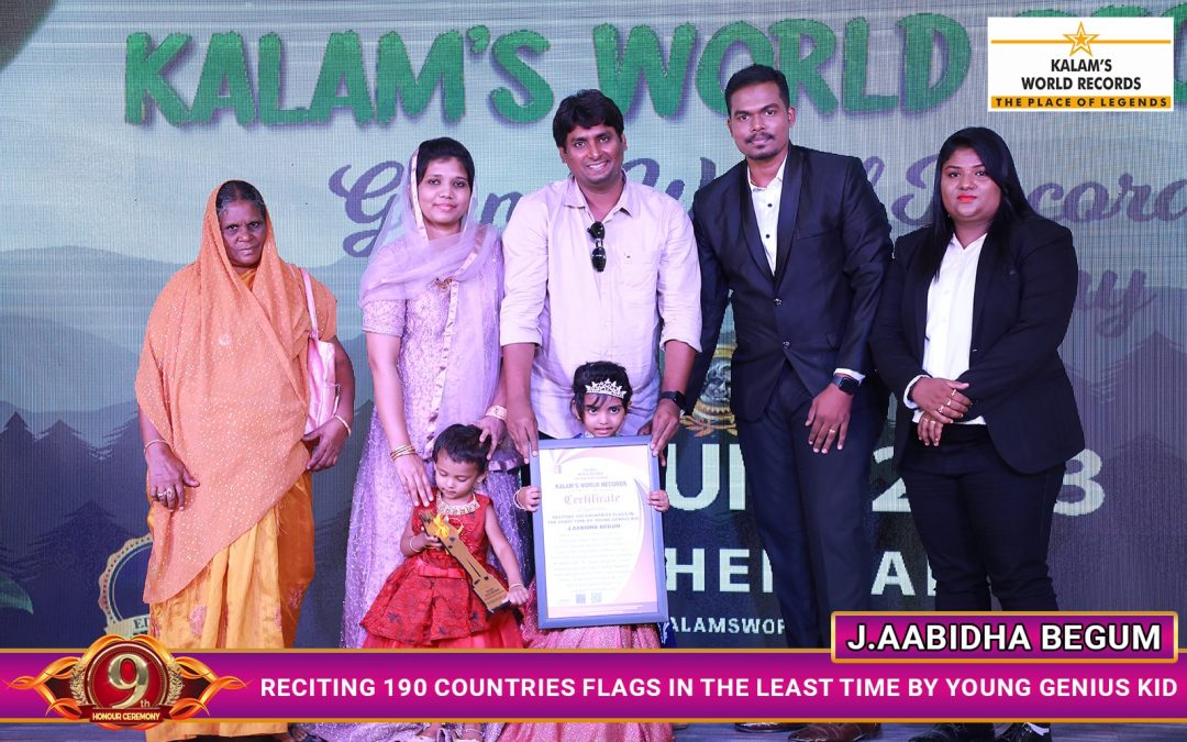 Born On 09-07-2019 In Tirunelveli, Tamilnadu, India.she Is Appreciated For Her Talent By Reciting 190 Countries Flags In The Least Time Of 8 Minutes And 30 Seconds By Young Genius Kid.we At Kalam’s World Records Are Appreciating Her Talent, Honouring Her On Stage With Big Applause, And Looking Forward To Her Future Stepping Stones.