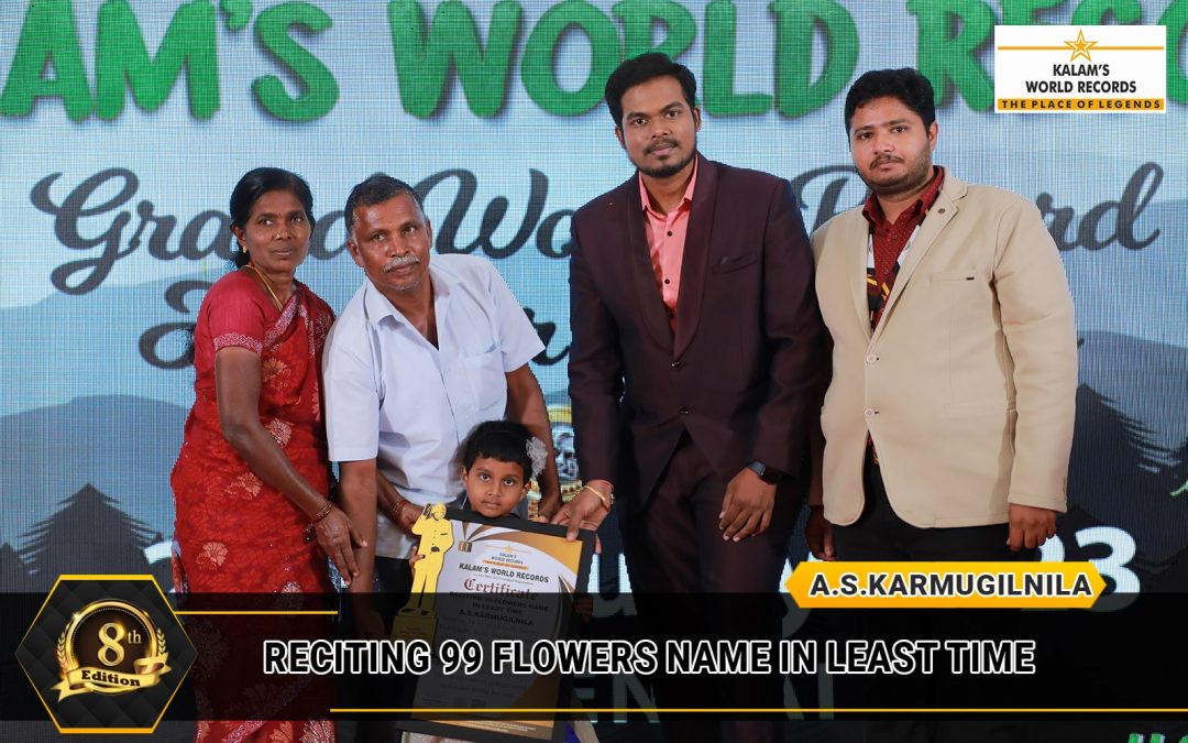 Born on 14-11-2018 From Salem, Tamilnadu, India. She Has Created a New World Record by Reciting 99 Flowers Names in the Least Time of 1 Minute. She Has Set a New World Record Dated 04-11-2022. This Achievement is Registered in Kalams World Records.