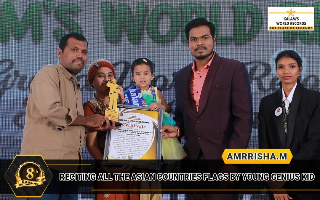 Born on 01-02-2020 From Bengaluru, Karnataka, India. She is Appreciated for Her Talent by Reciting All the Asian Countries Flags at the Tender Age of 2 Years and 11 Months. We at Kalam’s World Records Are Appreciating Her Talent, Honouring Her on Stage With Big Applause, and Looking Forward to Her Future Stepping Stones. Achievement Date 20-01-2023. This Achievement is Registered in Kalam’s World Records.