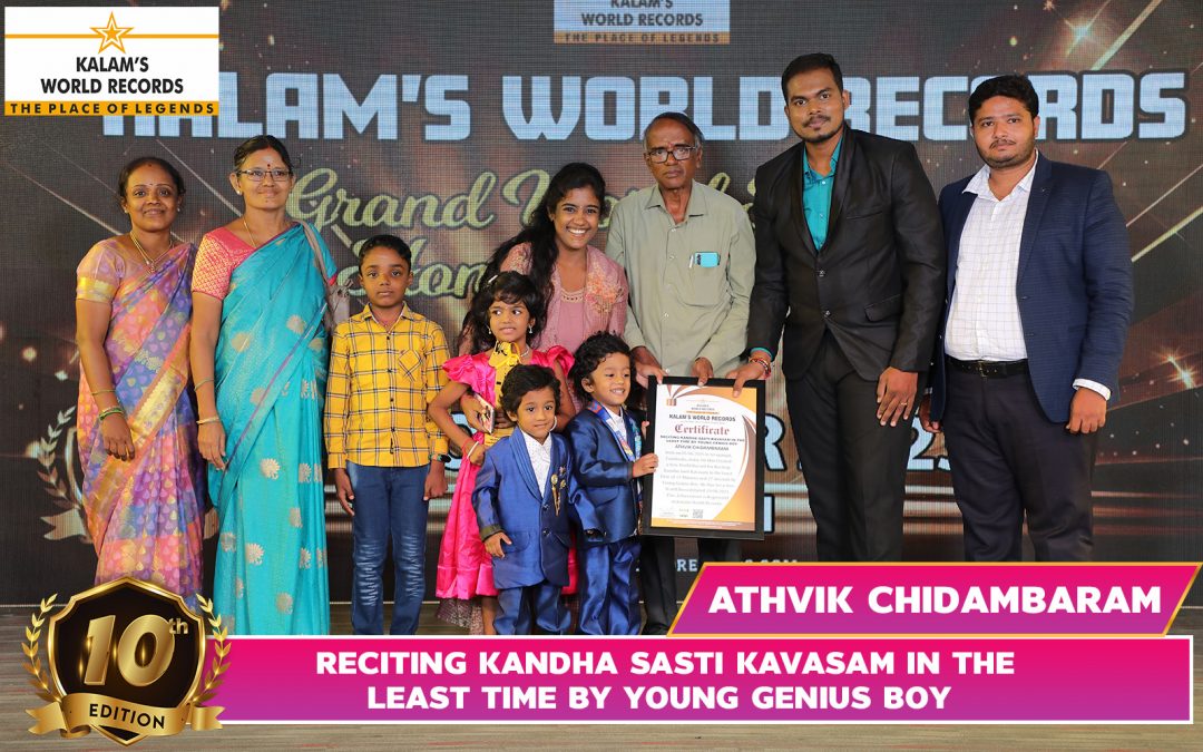 Born on 05-06-2020 in Sivagangai, Tamilnadu, India. He has created a New World Record for Reciting Kandha Sasti Kavasam in the Least Time of 15 Minutes and 27 Seconds by a Young Genius Boy. He Has Set a New World Record Dated 19-08-2023. This Achievement is Registered in Kalams World Records.