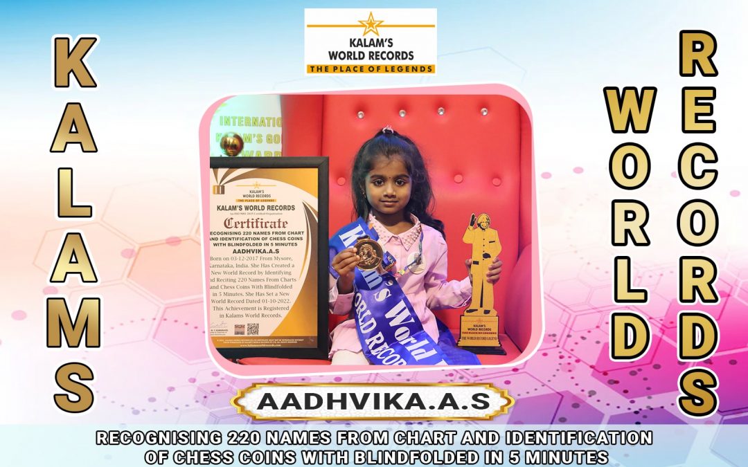 Born on 03-12-2017 From Mysore, Karnataka, India. She Has Created a New World Record by Identifying and Reciting 220 Names From Charts and Chess Coins With Blindfolded in 5 Minutes. She Has Set a New World Record Dated 01-10-2022. This Achievement is Registered in Kalams World Records.