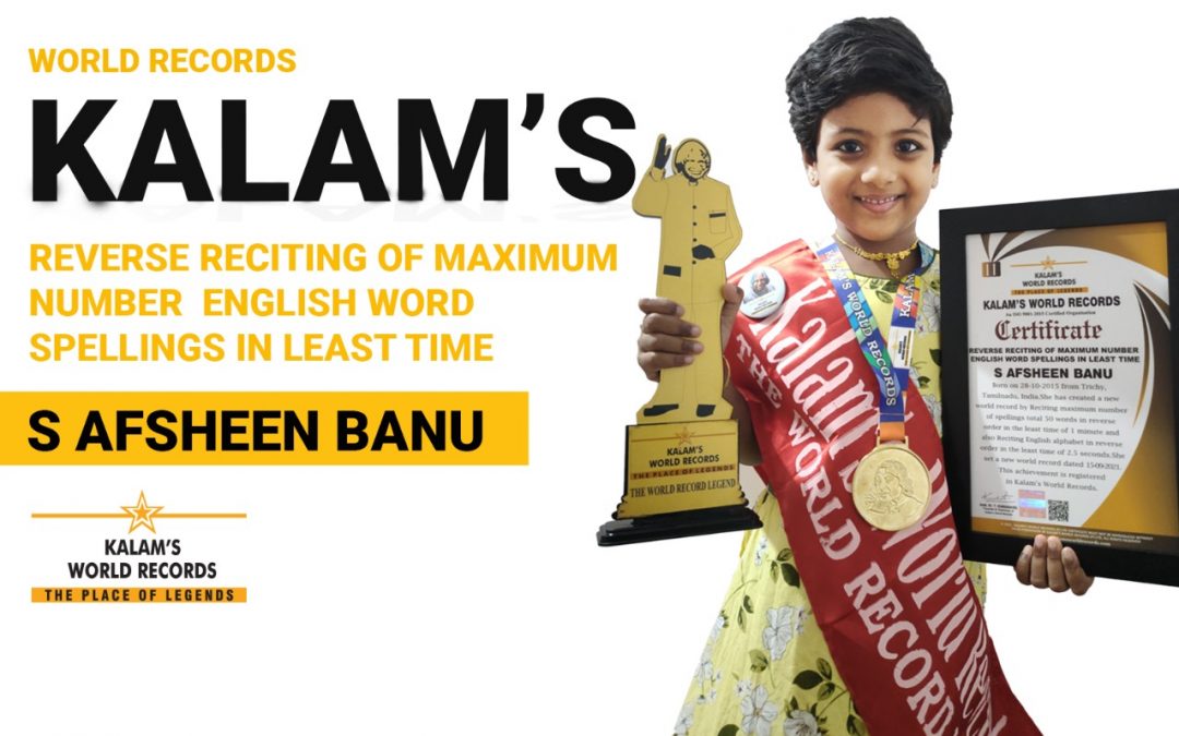 Born on 28-10-2015 from Trichy, Tamilnadu, India.She has created a new world record by Reciting a maximum number of spellings total of 50 words in reverse order in the least time of 1 minute and also Reciting the English alphabet in reverse order in the least time of 2.5 seconds. She set a new world record dated 15-09-2021. This Achievement is Registered in Kalam’s World Records.