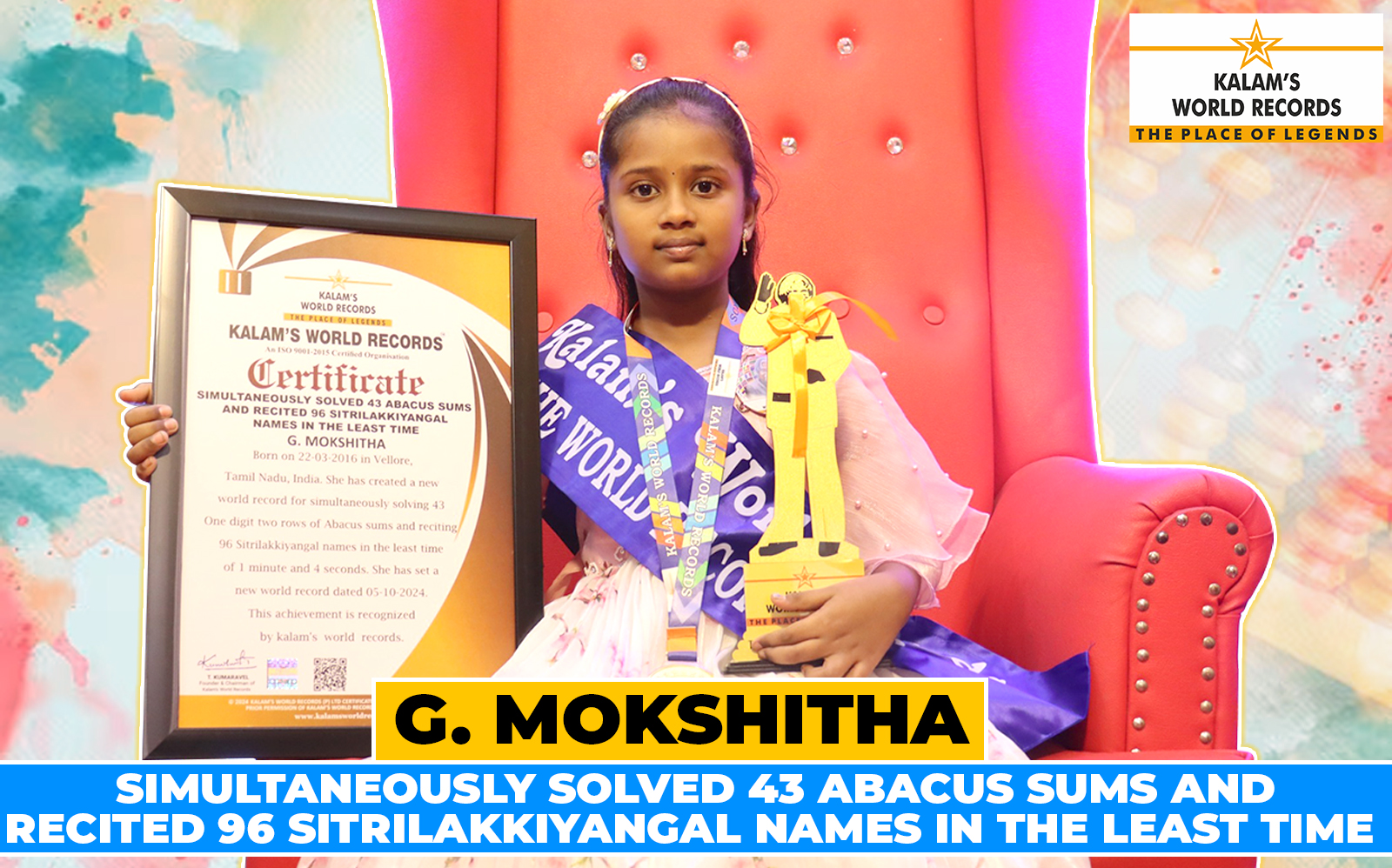 Born on 22-03-2016 in Vellore, Tamil Nadu, India. She Has Created a New World Record for Simultaneously Solving 43 One Digit Two Rows Abacus Sums and Reciting 96 Sitrilakkiyangal Names in the Least Time of 1 Minute and 4 Seconds. She Has Set a New World Record Dated 05-10-2024. This Achievement is Recognized by Kalam’s World Records.