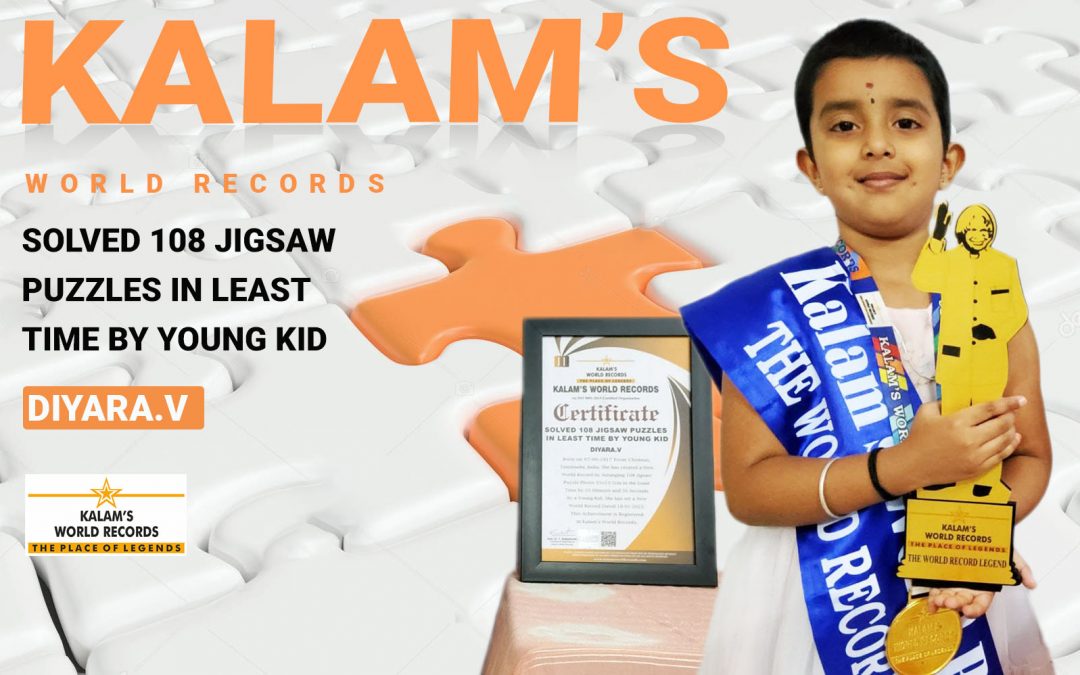 Born on 07-06-2017 from Chennai, Tamilnadu, India. She has created a new world record by arranging 108 jigsaw puzzle pieces 35×23.5cm in the least time by 10 minutes and 56 seconds by a young kid. She has set a new world record dated 18.01.2022. This achievement is registered in Kalam’s World Records.