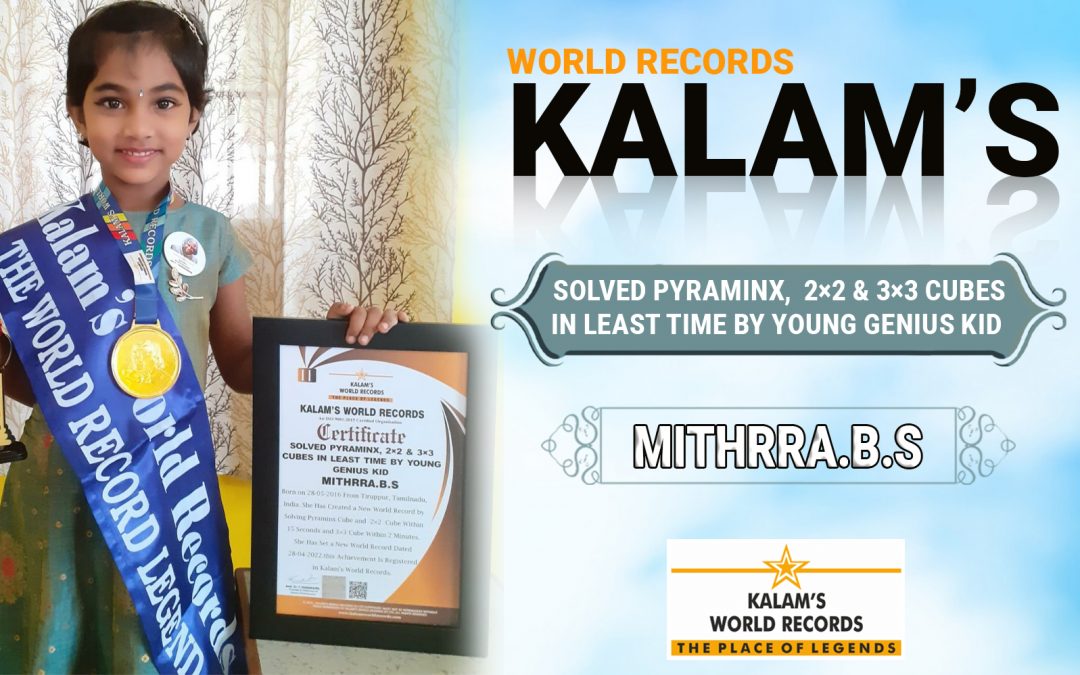 Born on 28-05-2016 From Tiruppur, Tamilnadu, India. She Has Created a New World Record by Solving Pyraminx Cube and 2×2 Cube Within 15 Seconds and 3×3 Cube Within 2 Minutes. She Has Set a New World Record Dated 28-04-2022. This Achievement Is Registered in Kalam’s World Records.
