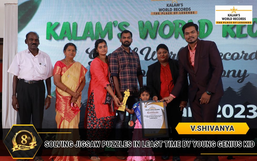 Born on 31-12-2019 From Ranipet, Tamilnadu, India. She is Appreciated for Her Talent by Solving 211 Pieces of Jigsaw Puzzles in the Least Time of 28 Minutes and 49 Seconds. We at Kalam’s World Records Are Appreciating Her Talent, Honouring Her on Stage With Big Applause, and Looking Forward to Her Future Stepping Stones. Achievement Date 25-02-2023. This Achievement is Registered in Kalam’s World Records.