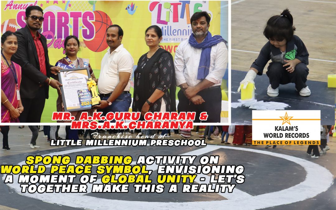 Mr. A.K. Guru Charan and Mrs. A.K. Charanya Franchise Head of Little Millennium Preschool Sowcarpet, Chennai, Tamilnadu, India Has Organised Group World Record Attempt for Creating a Largest Peace Symbol Through a Spong Dabbing Activity With a Size of 24 Feet X 24 Feet. The Record is Organized by Mrs. Charanya Franchise Head of Little Millennium Preschool, Sowcarpet. They Have Successfully Participated and Completed the Group World Record Attempt With More Than 80 Participants. The Record is Dated on 17-12-2023. This Achievement is Registered in Kalam’s World Records.