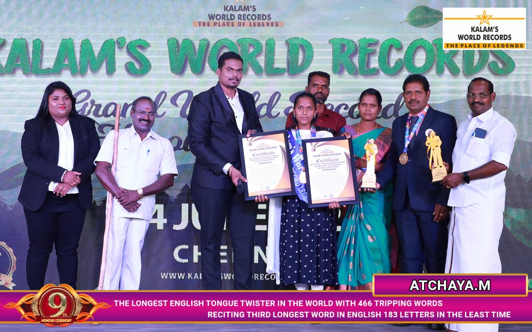 Born On 08-11-2007 In Pudukkottai, Tamilnadu, India.she Has Created A New World Record By Reciting Third Longest Word In English 183 Letters Are Lopadotemachoselachogaleokranioleipsanodrimhypotrimmatosilphiokarabomelitokatakechymenokichlepikossyphophattoperisteralketryonoptekephalliokigklopeleiolagoiosiraiobaphetraganopterygon In The Least Time Of 4 Second And 07 Milliseconds. And The Longest English Tongue Twister In The World With 466 Tripping Words for 1 minute and 54 seconds She Has Set A New World Record Dated 16-05-2023.this Achievement Is Registered In Kalams World Records.