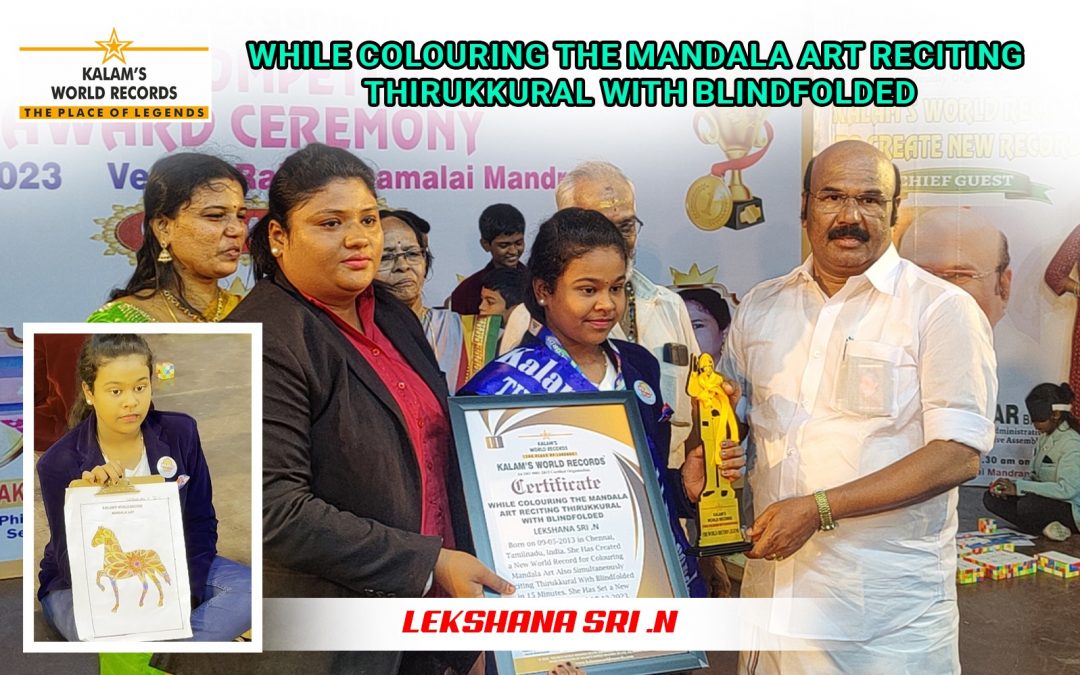 Born on 09-05-2013 in Chennai, Tamilnadu, India. She Has Created a New World Record for Colouring Mandala Art and simultaneously Reciting Thirukkural With Blindfolded in 15 Minutes. She Has Set a New World Record Dated 17-12-2023. This Achievement is Registered in Kalams World Records.