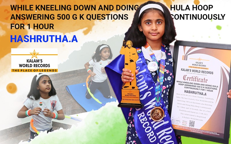 Born on 06-08-2013 from Chennai, Tamilnadu, India. She has created a New World Record by Answering 500 G.K Questions also kneeling down and doing Hula Hoops continuously for 1 hour and 54 seconds. She set a New World Record Dated on 15-08-2021. This Achievement is Registered in Kalam’s World Records.