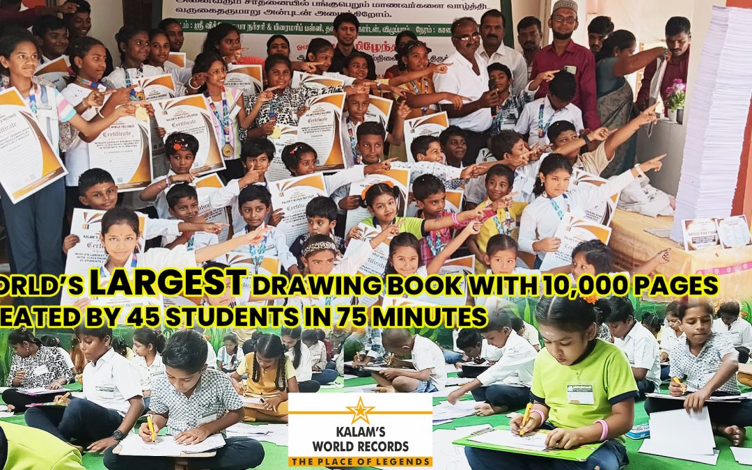 Villupuram, Tamil Nadu, India Has Organized a Group World Record Attempt for World’s Largest Drawing Book With 10,000 Pages Created by 45 Students in 75 Minutes. The Team Successfully Participated and Completed the Group World Record Attempt With 45 and Above Participants. This Record is Dated 26-04-2025.