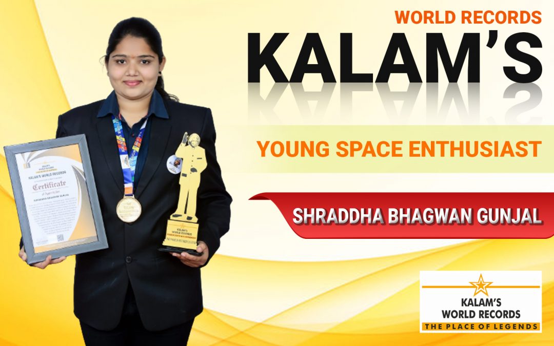 Shraddha Bhagwan Gunjal Born on 27-02-2003 From Ahmadnagar, Maharashtra Is Appreciate for Being a Space Enthusiast. She Received 10 Certificates From Reputed Institutions Including Nasa for Her Contribution to Observations of Near Earth Objects and Main Belt Asteroids by Participating in the Analysis of Images From Pan-stars. She Also Received a Space Magica Membership Passport With Validity Till December 2022. As We Kalam’s World Records Appreciating Her Talent and Honoring Her in the Stage of Big Applause and for Her Future Stepping Stone.