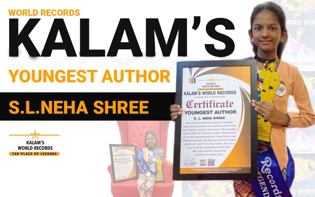 Born on 22-12-2010 in Chennai, Tamilnadu, India. She has created a new world record for being the “Youngest Author” of the book “The Incredible World”, (ISBN NO: 9789391537487) which speaks about the ongoing pandemic using fantasy and fictional characters. The book also has GK questions and deals with preserving nature. She set a new world Record Dated on 24-09-2021. This achievement is registered in Kalam’s World Records.