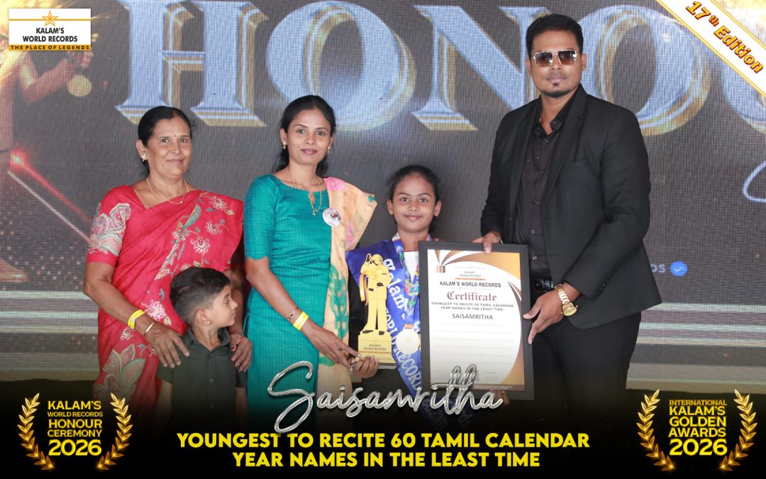 Born on 25-03-2017 in Coimbatore, Tamil Nadu, India. She Has Created a New World Record for the Fastest Recitation of 60 Tamil Calendar Year Names in the Least Time of 21 Seconds and She Has Set a New World Record. This Outstanding Achievement Was Successfully Accomplished on 28-01-2026 and Has Been Officially Recognized and Registered by Kalam’s World Records.