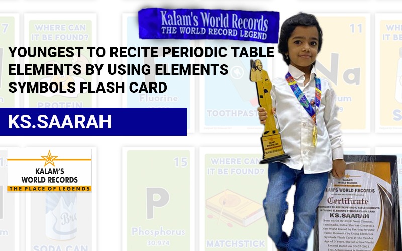 Born on 08-07-2018 from Chennai, Tamilnadu, India. She has created a New World Record by Reciting Periodic Table Elements by Using Elements Symbols Flash Card at the Tender Age of 3 Years. She set a New World Record Dated on 30-07-2021. This Achievement is Registered in Kalam’s World Records.