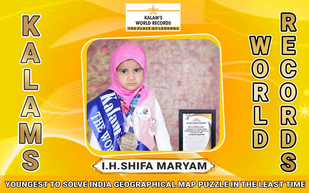Born on 21-09-2020 From Tiruppur, Tamilnadu, India. She Has Created a New World Record by Youngest to Solving India Geographical Map Puzzle in the Least Time of 4 Minutes’ and 58 Seconds. She Has Set a New World Record Dated 03-09-2022. This Achivement is Registered in Kalams World Records.